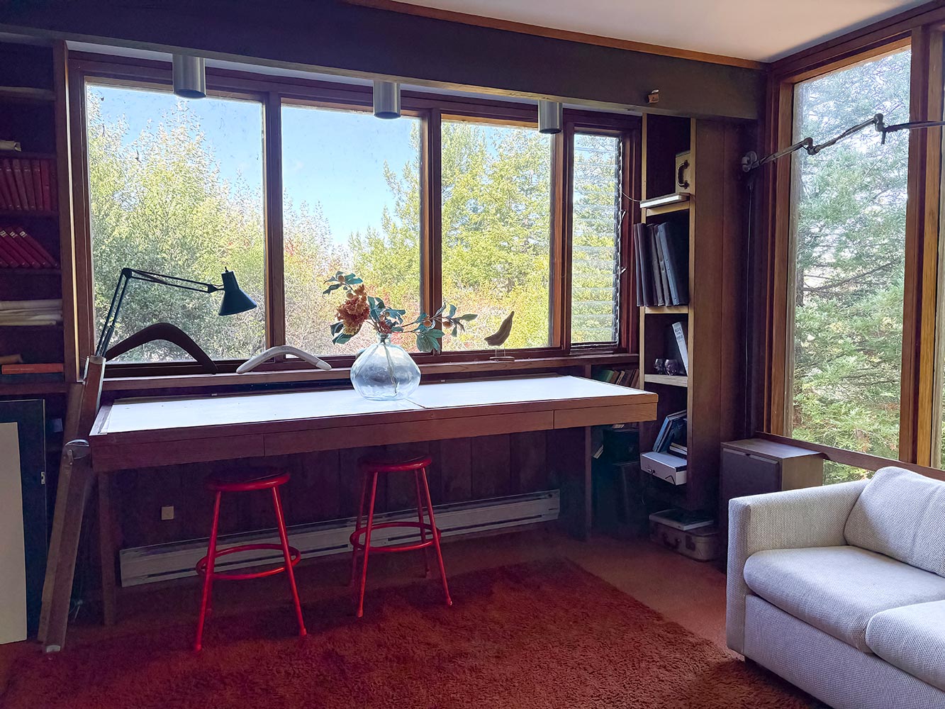 The house offers three bedrooms and two bathrooms and the master bedroom leads to his and her walk-in closets. There's an extra large laundry room with floor-to-ceiling windows and a built-in workspace. Located below the deck area is a large bonus architect's studio with half bath. The space is flooded with light from its two wrap-around walls of windows.